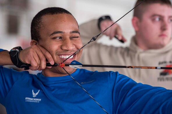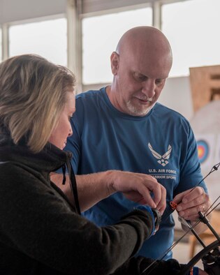 Jeff Matuszak, right, Warrior CARE coach, teaches, Amara Klika, Warrior CARE participant, how to position her hand on a compound bow during an archery training session at Joint Base Andrews, Md., Nov 13, 2017. This was one of many events hosted during the week-long Air Force Wounded Warrior CARE Event, which taught injured Airmen about the many programs available to help them rehabilitate. (U.S. Air Force photo by Airman 1st Class Valentina Lopez)