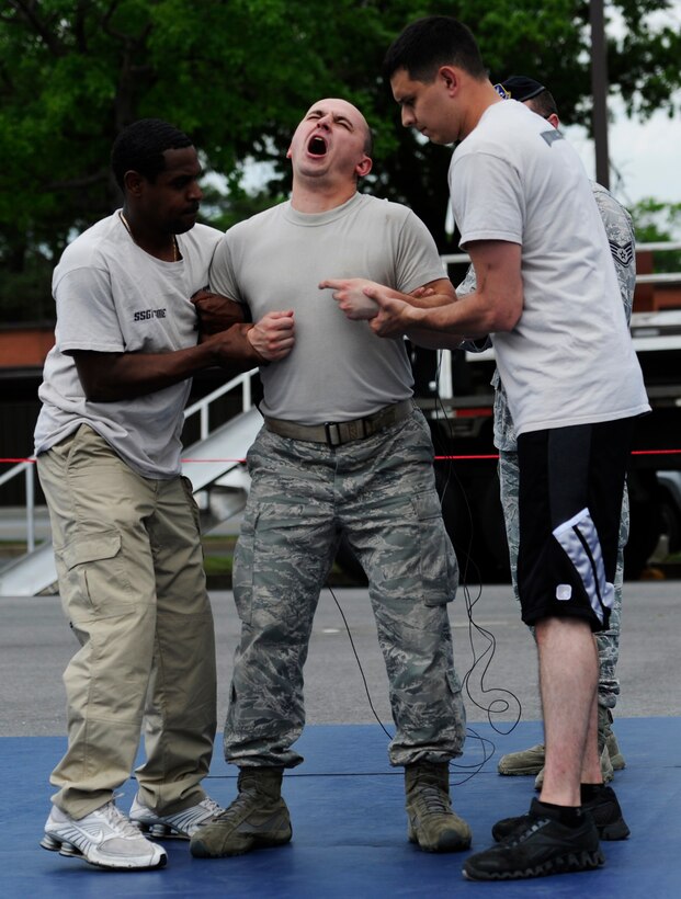Staff Sgt. Matthew Juhnke, 11th Civil Engineer Squadron explosive ordinance disposal journeyman, demonstrates the effects of being tazed during the National Police Week Tactical First Responders Demonstration on May 17, 2013 at Joint Base Andrews, Md. (U.S. Air Force photo/ Airman 1st Class Nesha Humes)