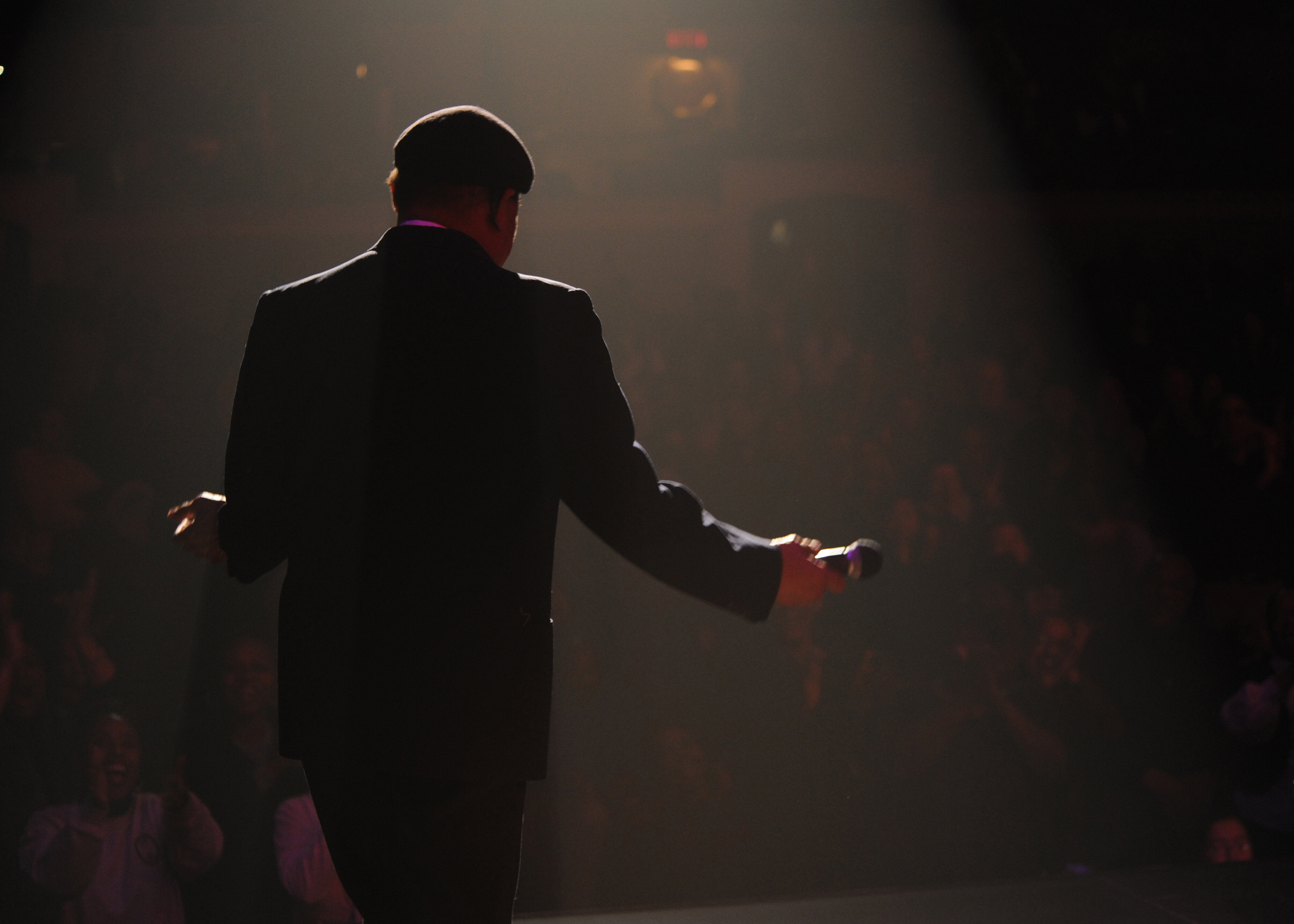 Seven-time Grammy Award winner Al Jarreau greets the audience as he walks on stage during his performance with the United States Air Force Band at the Daughters of the American Revolution Constitution Hall, Washington, D.C., Feb. 12. This performance was the latest installment of the bands Guest Artist Series. (U.S. Air Force photo\ Staff Sgt. Matt Coleman-Foster)