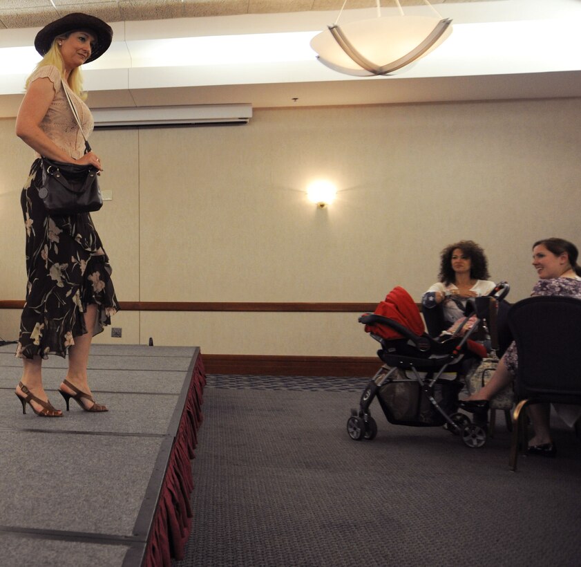Sally Guild, a member of the Andrews Officer's Spouses Club, models summer clothing from the Andrews Thrift Shop. The AOSC runs the shop, and distributes the proceeds back to the base and local community. (U.S. Air Force photo by Senior Airman Torey Griffith)(released)