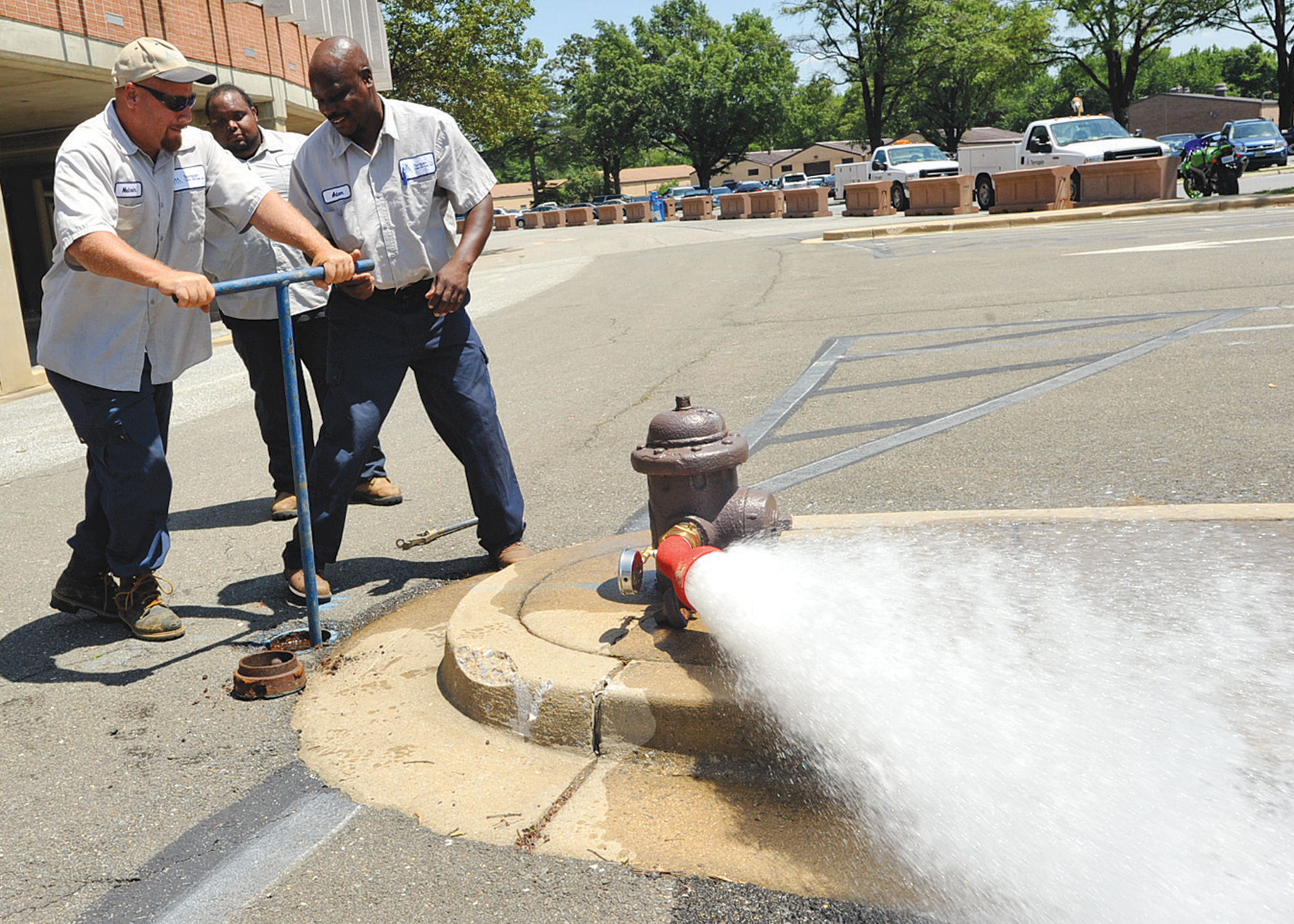 JOINT BASE ANDREWS, Md. -- Contractor utility men, Melvin Brooks, left, John Jones, center, and Adam Taylor, use a valve key to shut off the water pressure from a fire hydrant in the parking lot near the 316th Wing Headquarters, Bldg. 1535, June 19. Contracted under the 316th Civil Engineer Squadron, the workers performed a flow test on the fire hydrant to gauge the static pressure of water needed to support the fire protection system in the new BRAC headquarters facility, scheduled for completion March 2011. (U.S. Air Force photo by Bobby Jones)