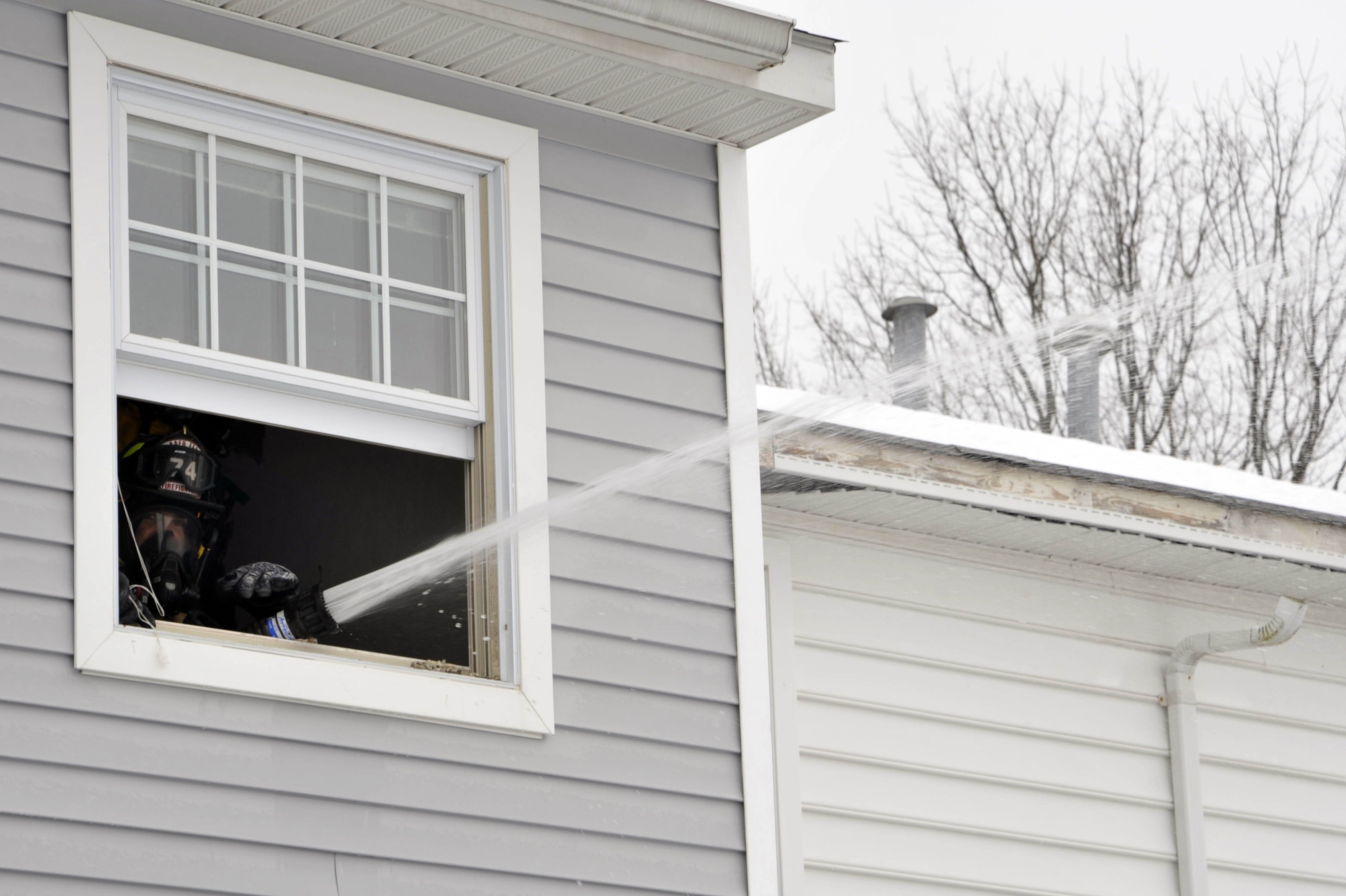Colonel Steven Shepro, Joint Base Andrews/316th Wing commander, uses a 1 3/4 inches hand-line to hydraulically ventilate a house on Joint Base Andrews, Md., Feb. 23, 2010. Spraying water out of the window causes negative pressure, which sucks the smoke out of the building to increase visibility. Colonel Shepro was accompanied by his Airman "shadow," and together they worked with the 316th Civil Engineer Squadron fire department for the day. (U.S. Air Force photo by Airman 1st Class Perry Aston) (Released)