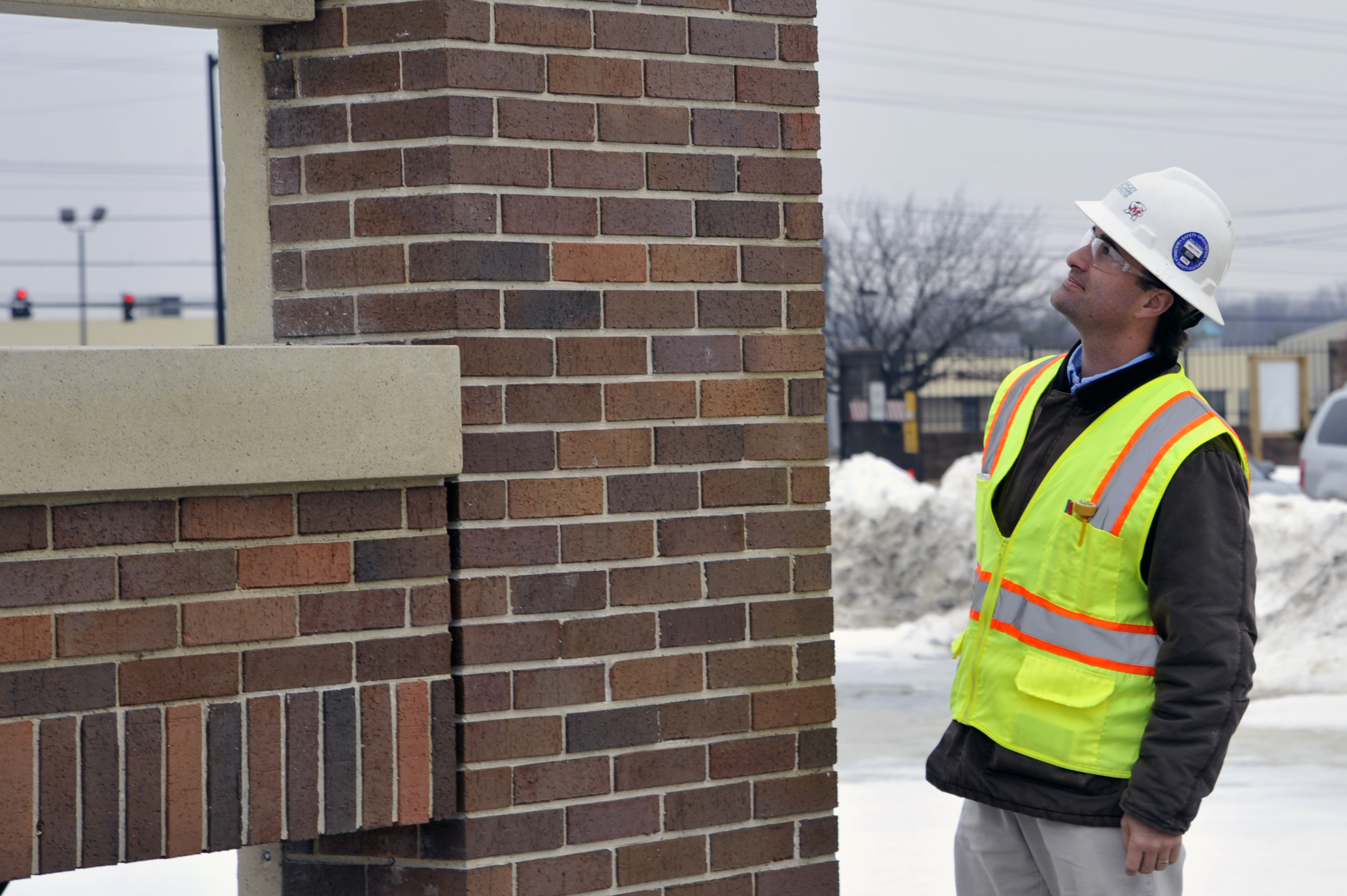 Keith Clemente, Coakley Williams Construction quality control specialist, inspects a mock-up of the facade for the new William A. Jones III headquarters building Feb. 23, 2010 at Joint Base Andrews, Md. Mr. Clemente must inspect the mock-up before it can be approved to be put on the building. (U.S. Air Force photo by Airman 1st Class Perry Aston) (Released)
