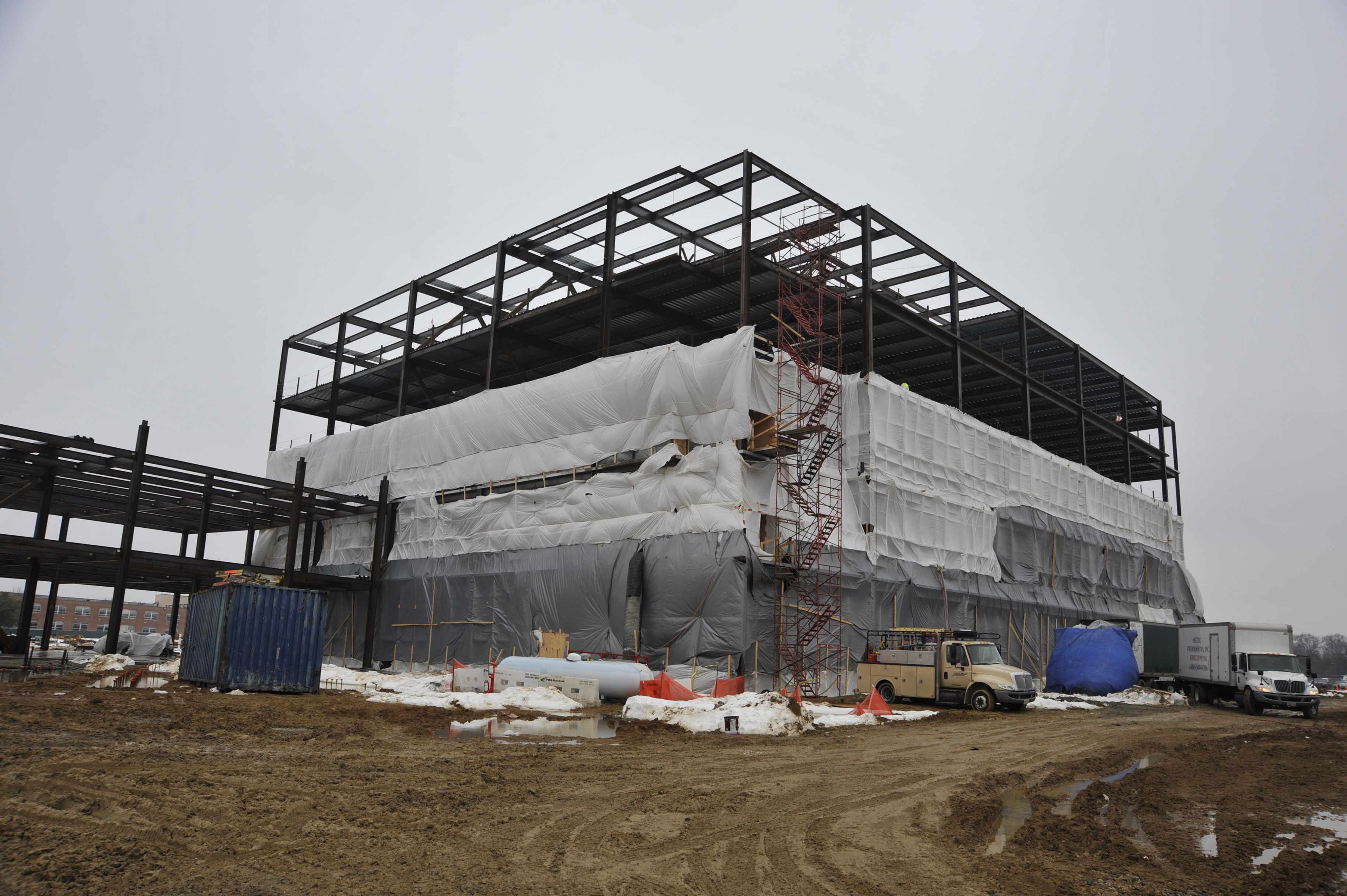 Contractors work on the new William A. Jones III headquarters building Feb. 23, 2010 at Joint Base Andrews, Md. The $114.2 Million building is Leadership in Energy and Environmental Design (LEED) Silver certified, and is slated to be five stories, 380,000 square feet, and will hold more than 2,500 personnel. The building is scheduled to be completed next year. (U.S. Air Force photo by Airman 1st Class Perry Aston) (Released)