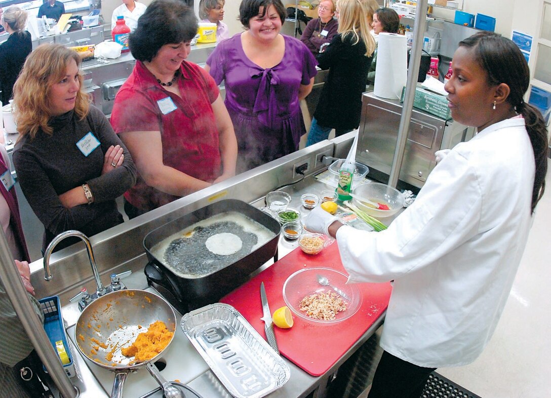 Tech. Sgt. Natika Washington has a captive audience a she gives instruction on how to prepare Sweet Potato Ravioli during the Culinary Holiday hosted by the 89th Airlift Wing's flight attendants on Dec. 12. Sergeant Natikais a flight attendant assigned to the 99th Airlift Squadron. (US Air Force/Bobby Jones)