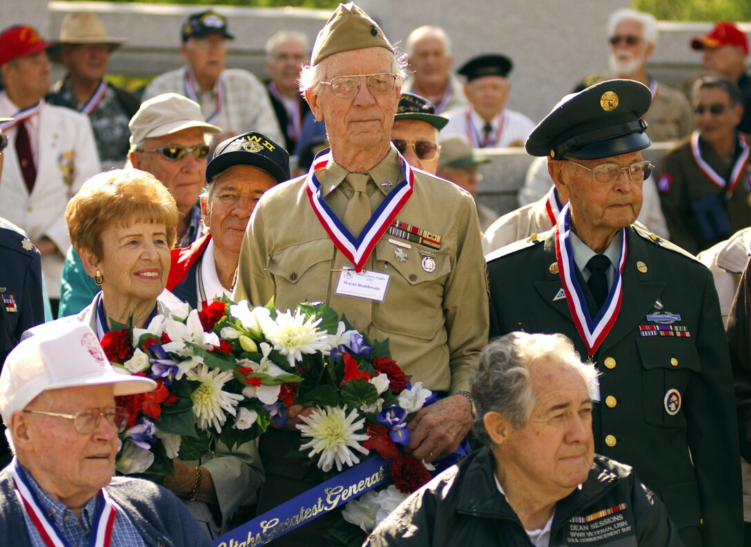 World War II veterans from Utah place a wreath from the Hero Flight 2007 program at the National World War II Memorial in Washington, D.C., Sept. 15. Hero Flight is an all-volunteer program that sets up trips to allow as many World War II veterans as possible to visit the National World War II Memorial. (U.S. Air Force photo/Staff Sgt. Suzanne Day)