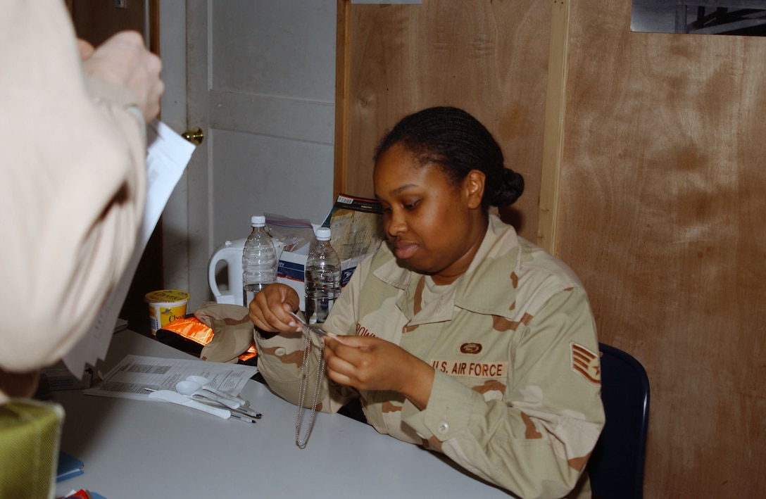 BALAD AIR BASE, Iraq -- Staff Sgt. Shereka Brown 332nd Expeditionary Mission Support Group PERSCO team member, verifies identification information Jan. 2. Sergeant Brown is deployed from Andrews Air Force Base, Md. (U.S. Air Force photo by Staff Sgt. Alice Moore)
