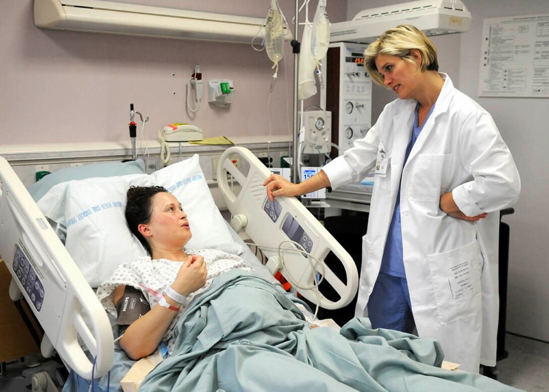 Major Christine Gundel, 779th Medical Group nurse midwife, checks on Monica McCoy, Public Affairs Specialist for Naval Sea Systems Command in Washington D.C. and patient at the Maternal Child Unit at Malcolm Grow Medical Center, before her scheduled cesarean-section. (USAF photo by Tech. Sgt. Suzanne M. Day)