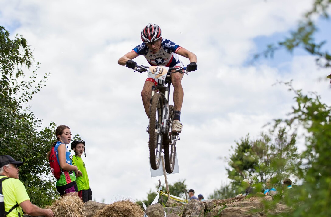 Senior Airman David Flaten executes a "bunny hop” or lifting up of both wheels of the bike off the ground, then exploding upward to clear any obstructions in one’s path, during the 2013 Conseil International Sport Militaire (CISM) cycling competition. The 811th Security Forces Squadron protective service member was selected to represent the United States Armed Forces for the cycling championship event held Sept. 2 to Sept. 6, in Leopoldsburg, Belgium. (Courtesy photo)