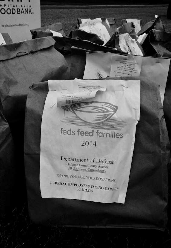 A food-filled bag sits, waiting to be loaded in a box and be picked up at the 89th Airlift Wing headquarters building at Joint Base Andrews, Md., Sept. 9, 2014. The food was collected by 89th AW members to support the Feds Feed Families campaign, a U.S. Department of Agriculture program. This food and 17 other boxes like it will be delivered to Waldorf to feed less-fortunate families in that area. (U.S. Air Force photo by Master Sgt. Kevin Wallace/RELEASED)