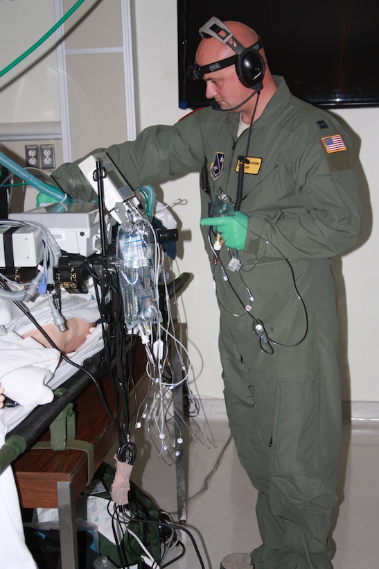 Capt. Andrew Ray Severns, an Air Force critical care nurse, monitors a "patient" during Critical Care Air Transport Team (CCATT) Simulation Day training in Walter Reed Bethesda simulation center on Dec. 11. Physicians, nurses and respiratory therapists were able to hone their critical care skills on life-like manikins using virtual reality machines and equipment in the high-tech, state-of-the-art simulation center. (Photo by Bernard S. Little)