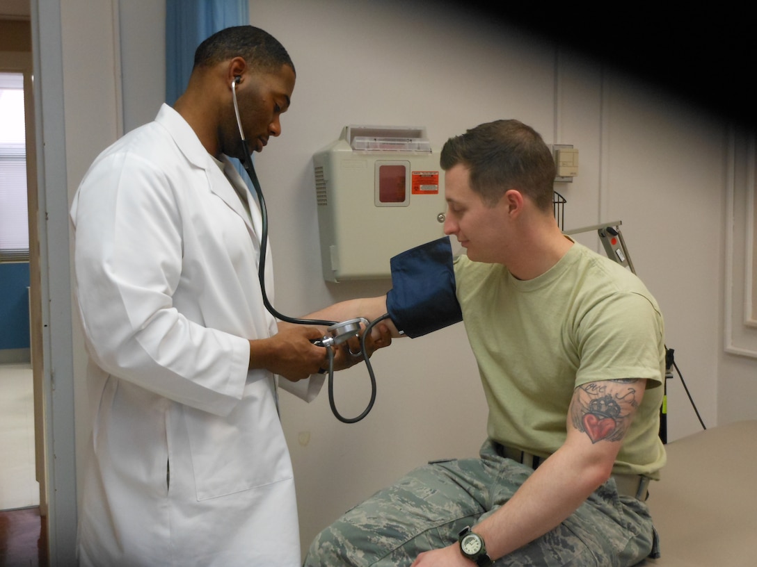 Dr. Derric Whiteside, 779th Medical Operations Squadron, Internist, takes the blood pressure of Senior Airman Timothy McSheehy, 779th Medical Operations Squadron, Medical Technician.