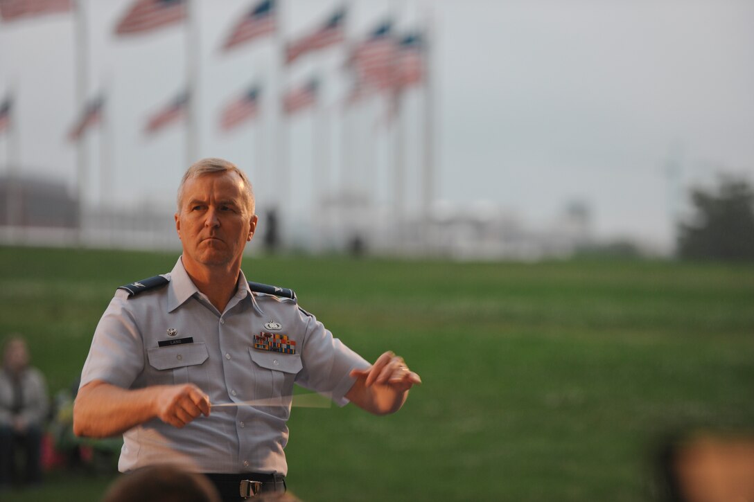 Col. Larry H. Lang, U.S. Air Force Band commander, conducts members of the Concert Band at the Sylvan Theatre, District of Columbia, June 3, 2015. The concert was part of the U.S. Air Force Band’s Summer Concert series. (U.S. Air Force photo/ Airman 1st Class J.D. Maidens)