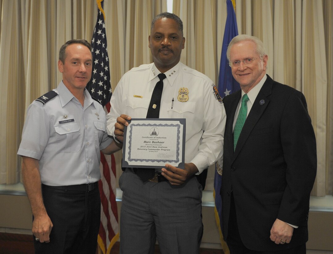 Craig Howard, center, Prince George’s County assistant police chief, receives a certificate on behalf of Mark Magaw, Prince George’s County police chief, from Col. Bradley Hoagland, left, 11th Wing commander, representing the 11th Security Forces commander; and Jim Estepp, Andrews Business & Community Alliance president and chief executive officer and Senior Andrews Ambassador, May 29, 2015, at The Club, Joint Base Andrews, Md. The Joint Base Andrews Honorary Commander Program encourages an exchange of ideas and experiences, as well as partnerships between key leaders of the base's surrounding communities, JBA commanders and Airmen. (U.S. Air Force photo by Senior Airman Preston Webb/RELEASED)