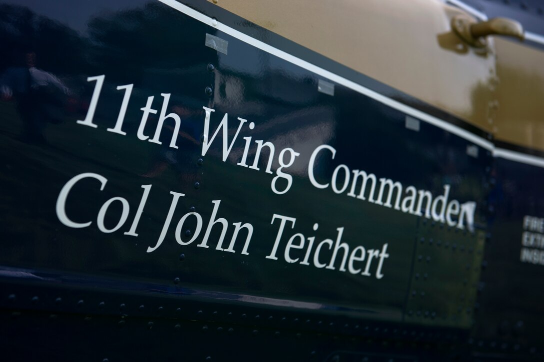Col. John Teichert, the new 11th Wing and Joint Base Andrews commander, has his name revealed on the side of a 1st Helicopter Squadron UH-1N Huey helicopter during the change of command ceremony on the Ceremonial Lawn at Joint Base Anacostia-Bolling, Washington, D.C., July 12, 2016. Joint Base Andrews is home to two higher headquarters, six wings, more than 80 tenant organizations and an estimated 17,000 personnel. (U.S. Air Force photo by Airman 1st Class Philip Bryant)