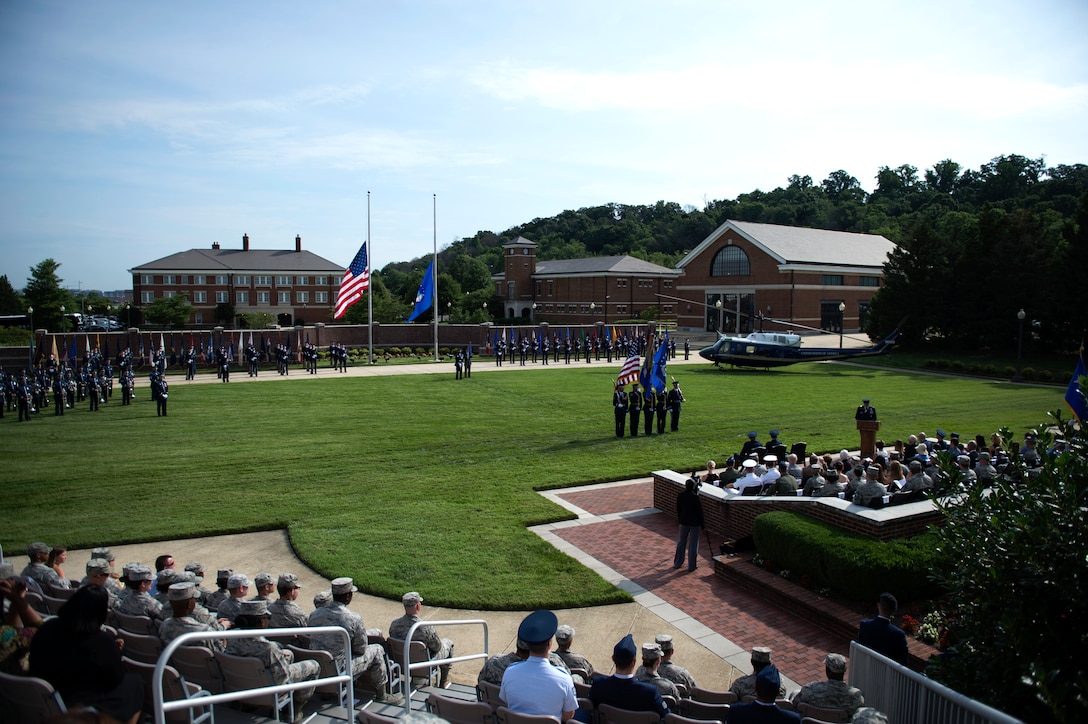 Maj. Gen. Darryl Burke, Air Force District of Washington commander, speaks during a change of command ceremony held on the Ceremonial Lawn at Joint Base Anacostia-Bolling, Washington, D.C., July 12, 2016. This ceremony transfers command of the 11th WG and Joint Base Andrews from Col. Bradley Hoagland to Col. John Teichert. (U.S. Air Force photo by Airman 1st Class Philip Bryant)