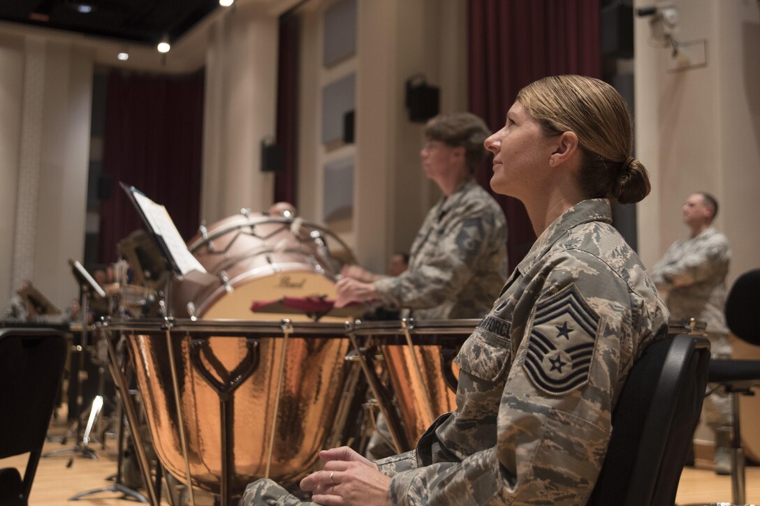 Chief Master Sergeant Beth Topa, 11th Wing command chief master sergeant, listens to a performance by the U.S. Air Force Concert Band during an immersion tour at Joint Base Anacostia-Bolling in Washington, D.C., Aug. 9, 2016. The purpose of the visit was for Col. E. John Teichert, 11th WG and Joint Base Andrews commander, and Topa to become more familiar with the U.S. Air Force Band and Honor Guard missions. (U.S. Air Force Photo by Airman 1st Class Rustie Kramer)