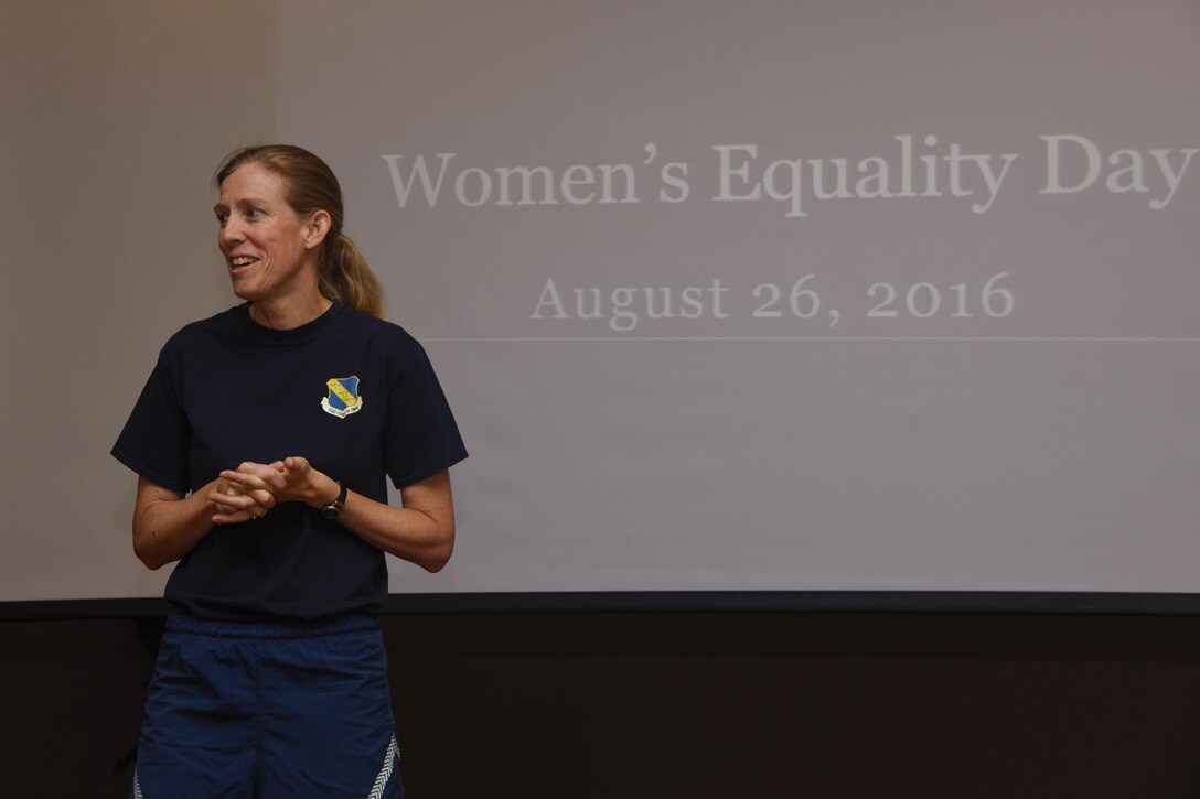 Col. Julie Grundahl, 11th Wing and Joint Base Andrews vice commander, talks at the opening ceremony of the Women’s Equality Day fun run at the Community Commons on JBA, Md., Aug. 26, 2016. She talked about the many accomplishments of women throughout history, such as the time the United States guaranteed all American women the right to vote in 1920. (U.S. Air Force photo by Airman 1st Class Valentina Lopez)