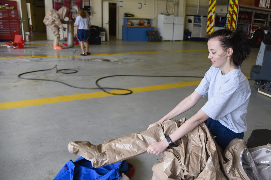 Airman 1st Class Carol Pruitt, 11th Civil Engineer Squadron readiness and emergency manager, dresses in a hazardous material suit during HAZMAT training on Joint Base Andrews, Md., Sept. 29, 2016. HAZMAT training is designed for emergency responders to prepare for toxic leaks, spills or accidents that may cause further damage to life, health, properties or the environment. (U.S. Air Force photo by Airman 1st Class Valentina Lopez)