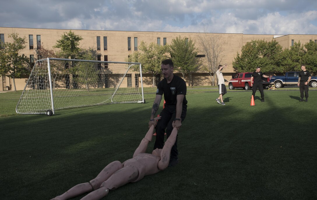 Senior Airman Brian Jurek, 11th Security Force Squadron emergency service team member, drags a dummy during the inaugural Battle of the Badges at Joint Base Andrews, Md., Oct. 21, 2016. Nine teams competed in timed events including a litter carry, dummy drag, weapons assembly and half-mile run while holding an explosive ordinance disposal training device. (U.S. Air Force photo by Airman 1st Class Rustie Kramer)