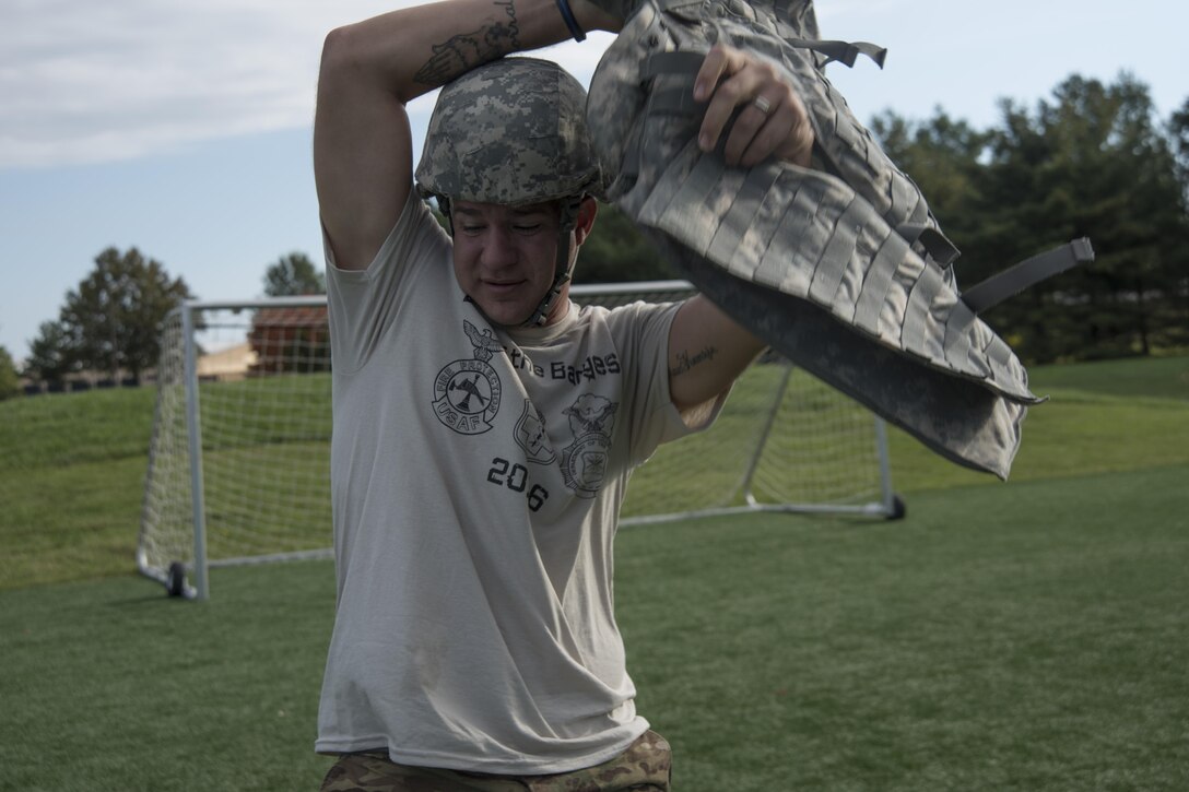 Staff Sgt. Courtney Corral, 11th Security Support Squadron security forces trainer, puts on a flak vest before an event during the Battle of the Badges at Joint Base Andrews, Md., Oct. 21, 2016. Nine teams competed in timed events including a litter carry, dummy drag, weapons assembly and half-mile run while holding an explosive ordinance disposal training device. This was the first year the event was held at JBA. (U.S. Air Force Photo by Airman 1st Class Rustie Kramer)