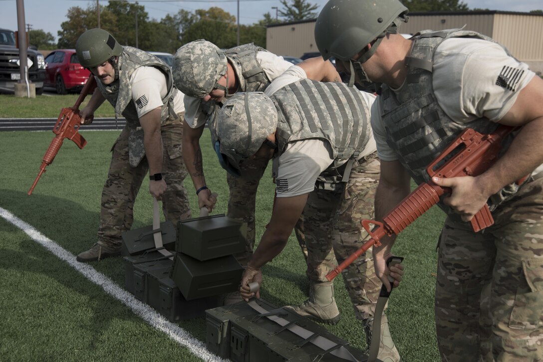 Members of the 11th Security Support Squadron compete in a timed event during the inaugural Battle of the Badges at Joint Base Andrews, Md., Oct. 21, 2016. Teams were challenged with carrying 13 ammunition cans and weapons 40 yards without allowing them to touch the ground. (U.S. Air Force Photo by Airman 1st Class Rustie Kramer)