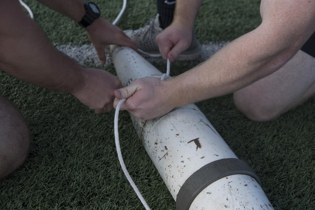 Staff Sgt. Jeffrey Reinke and Senior Airman Michael Norris, 11th Security Forces Squadron security forces members, tie a rope to an explosive ordinance disposal training device during the Battle of the Badges at Joint Base Andrews, Md., Oct. 21, 2016. Battle of the Badges was a competition between JBA’s emergency response units held, to bring the emergency units together to build camaraderie through friendly competition. (U.S. Air Force photo by Airman 1st Class Rustie Kramer)