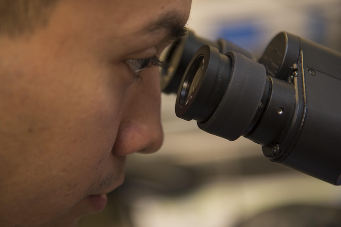 U.S. Army Specialist Victor Valadez, Public Health Command District animal care specialist, looks into a microscope at the Veterinary Treatment Facility on Joint Base Andrews, Md., Dec. 13, 2016. Valadez checks in animals for their appointments, takes vitals, runs lab tests, restrains animals and assists the veterinarian. (U.S. Air Force photo by Airman 1st Class Valentina Lopez)