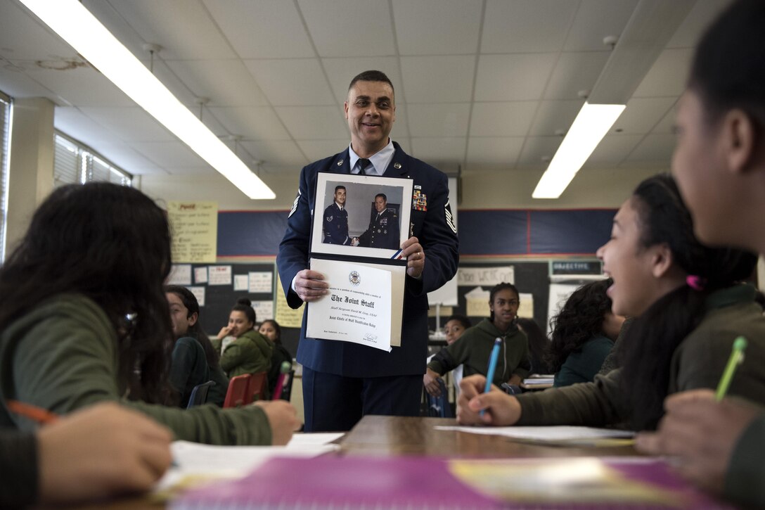 Master Sgt. David Gray, 113th Air National Guard security forces member, shows Charles Carroll Middle School students a photo from when he worked with the Chairman of the Joint Chiefs of Staff Gen. Colin Powell in New Carrollton, Md., Dec. 21, 2016. During a Career and Technical Education Fair, students were briefly introduced to some of the opportunities the U.S. Air Force can present and what it means to be in the Air Force. (U.S. Air Force photo by Senior Airman Philip Bryant)