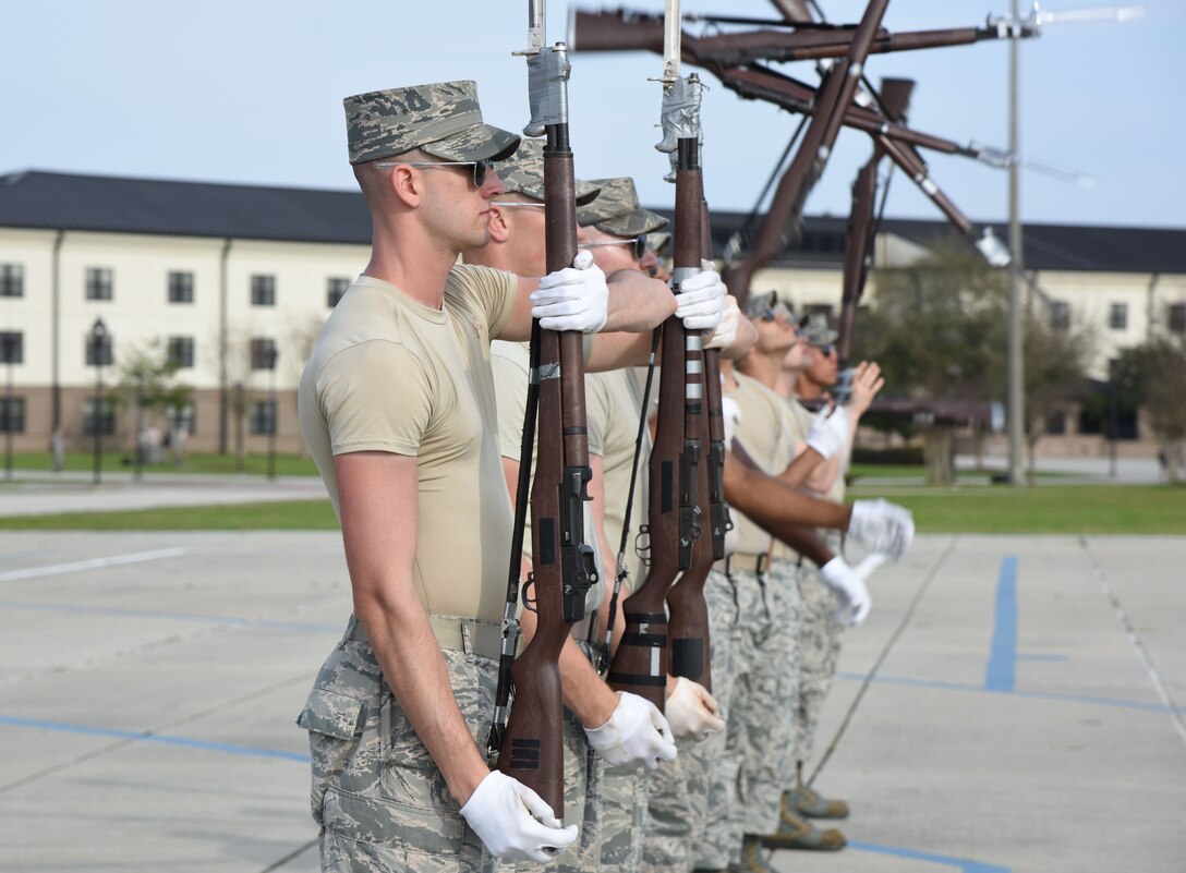 Airmen from the U.S. Air Force Honor Guard Drill Team practice a new routine on the Levitow Training Support Facility drill pad Feb. 26, 2016, on Keesler Air Force Base, Miss. The team comes to Keesler every year for five weeks to develop a new routine, which is then revealed during an 81st Training Group drill down competition. The team preforms the routine used throughout the year. (U.S. Air Force photo by Kemberly Groue)