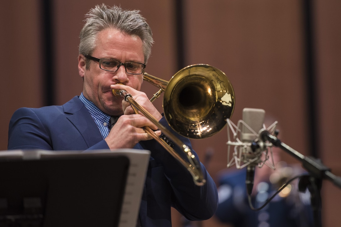 Marshall Gilkes, guest jazz trombonist, performs during a Jazz Heritage Series concert in Alexandria, Va., April 20, 2017. Gilkes is an accomplished musician, was nominated for two Grammy Awards and voted “Rising Star” by DownBeat Magazine's Critics Poll multiple occasions. He is one of many jazz icons who have participated in the series, which began in 1990. (U.S. Air Force photo by Airman 1st Class Valentina Lopez)
