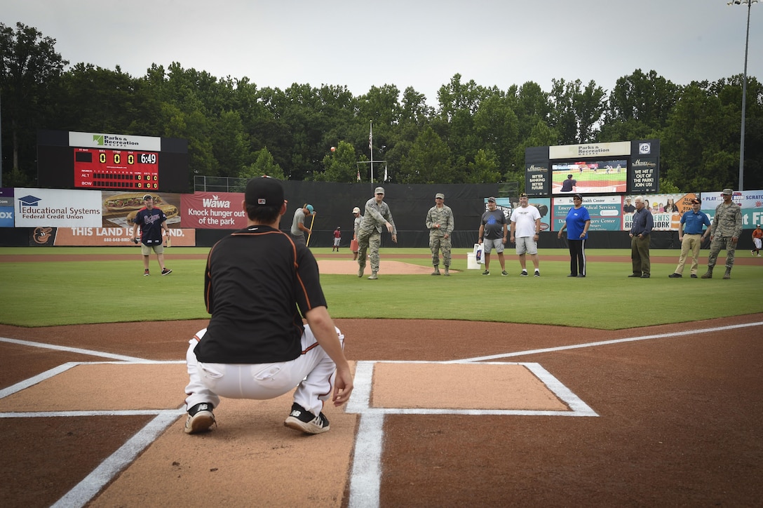 Several Airmen throw the ceremonial first pitch during Joint Base Andrews Military Appreciation Night hosted by the Bowie Baysox at the Prince George’s Stadium, in Bowie, Md., July 21, 2017. Several military members participated in opening ceremonies including the presenting of the colors, singing the national anthem, and throwing out the ceremonial first pitch. (U.S. Air Force photo by Senior Airman Mariah Haddenham)