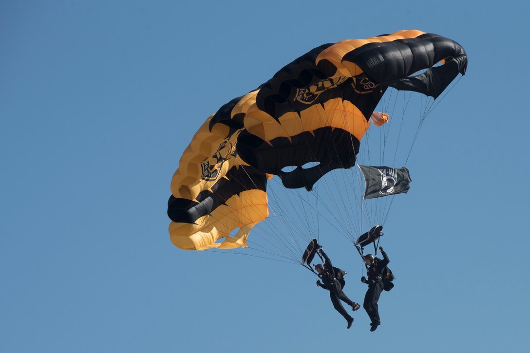 A U.S. Army Golden Knight parachute team descends to the ground at the opening ceremony of the 2017 Andrews Air Show: Air and Space Expo at Joint Base Andrews, Md., Sept. 15, 2017. The air show featured demonstrations by the Air Force Thunderbirds, Army Golden Knights, and the Air Force F-22 Demonstration Team.
