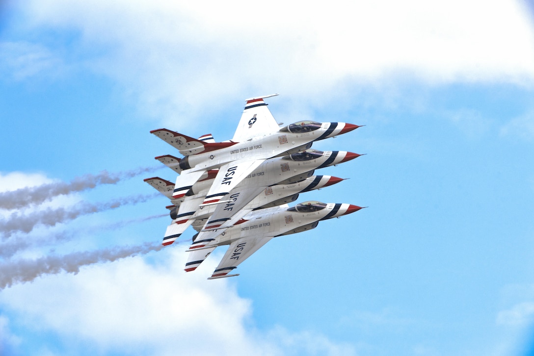 U.S. Air Force Thunderbirds perform an aerial demonstration over Joint Base Andrews, Md., during the 2017 Andrews Air Show: Air and Space Expo Sept. 15, 2017. For 62 years, the Thunderbirds have represented the epitome of Air Force precision and dedication. (U.S. Air Force photo by Senior Airman Delano Scott)