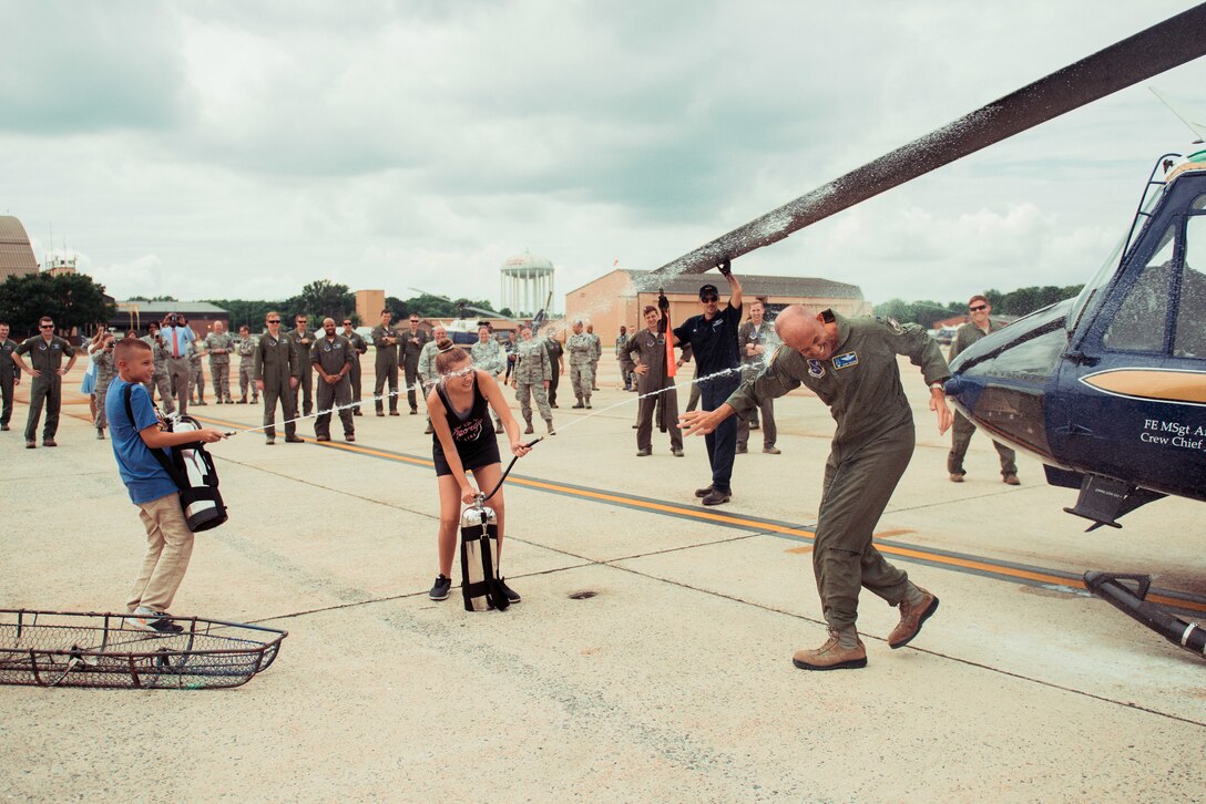 Two children of Col. E. John Teichert, former 11th Wing and Joint Base Andrews commander, spray their father after his final flight, or fini-flight, at JBA, Md., July 6, 2018. As part of the tradition of fini flights, family and friends upon exiting the aircraft soak the aircrew member. (U.S. Air Force photo by Staff Sgt. Delano Scott)