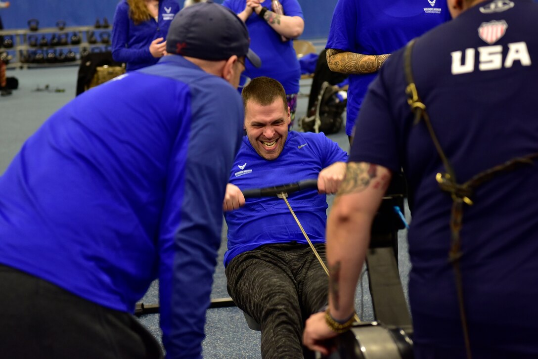 Master Sgt. Adam Boccher, wounded warrior, pushes himself during a rowing exercise for the Norhteast Warrior CARE event on Joint Base Andrews, Md., Nov. 14, 2018. The athletes tested themsleves againt each other during timed trials. (U.S. Air Force photo by Airman Noah Sudolcan.)