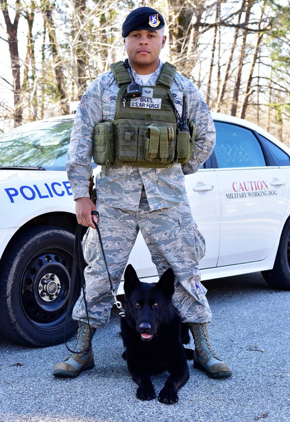 Senior Airman Clifton Giles, 11th security support squadron military working dog handler, and his dog, Jerry, pose for a picture on Joint Base Andrews Md., March 12, 2019. Giles and Jerry have worked together since February 2018. (U.S. Air Force photo by Airman 1st Class Noah Sudolcan)