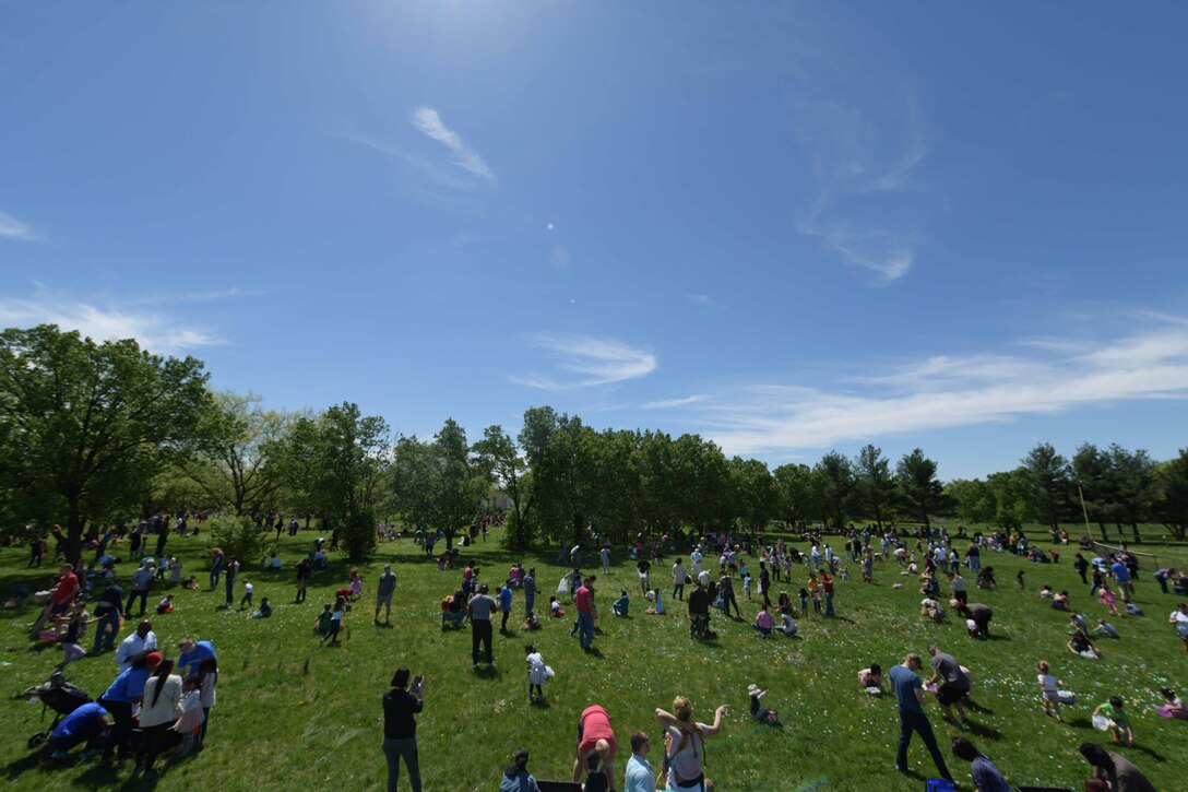 Families gather for the Bunnies and Eggs, egg hunt on Joint Base Andrews, Md., April 20, 2019. This event, hosted by the 11th Force Support Squadron and the JBA Chapel, holds the record for the largest Department of Defense Easter egg hunt, with approximately 115,000 eggs and more than 2,000 persons in attendance. (U.S. Air Force photo by Senior Airman Alyssa D. Van Hook)