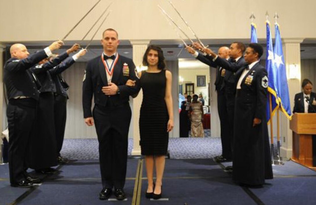 Then-Senior Master Sgt. Thomas Daniels poses for a photo with his daughter, Dakotah Daniels 15, during a Chief Induction Ceremony at Joint Base Anacostia-Bolling, Washington D.C., in January 2013. (Courtesy photo)