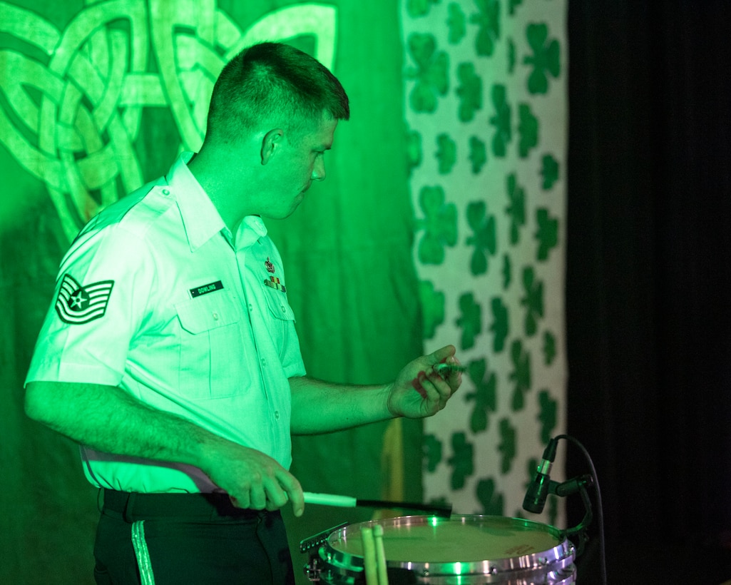 Tech. Sgt. Daniel Dowling, U.S. Air Force Band ensemble Celtic Aire percussionist, performs at the 38th Annual North Texas Irish Festival in Dallas, Tx., March 8, 2020. The North Texas Irish Festival was March 6-8, and provided an opportunity for Celtic Aire to perform music that reflects the culture of the Irish and put a classic spin on modern pop songs. (U.S. Air Force photo by Staff Sgt. Jared Duhon)