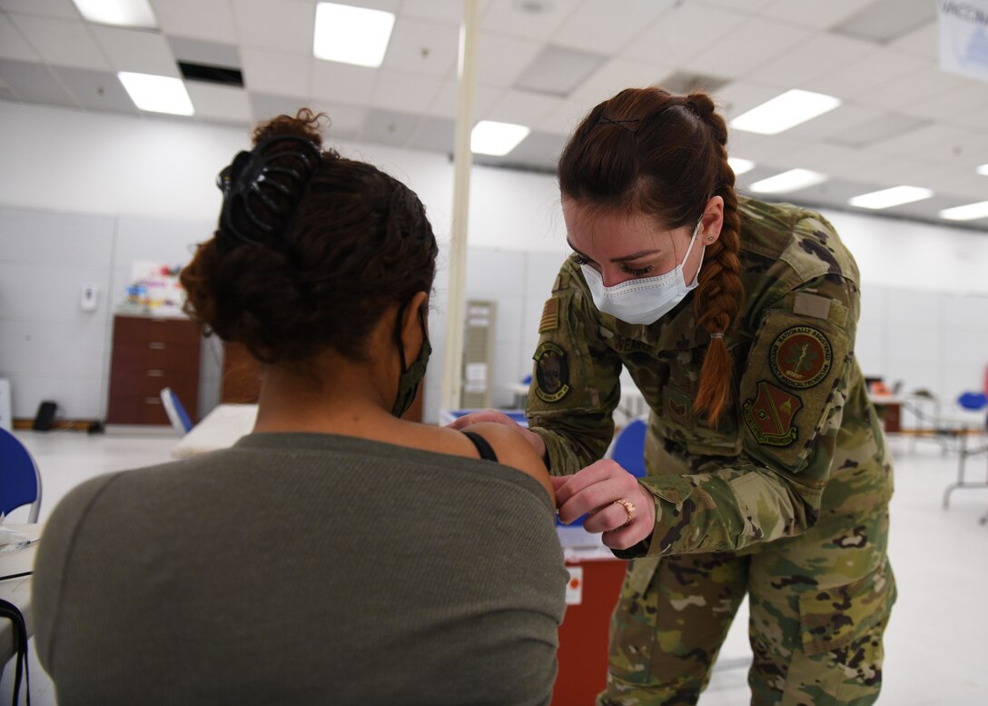 Staff Sgt. Makayla Weaver, 316th Surgical Operations Squadron medical technician, bandages a patient after administering a COVID-19 vaccine dose at Joint Base Andrews, Md., March 12, 2021. Currently, retirees, front-line emergency responders and personnel with certain prior medical conditions may get vaccinated at JBA. (U.S. Air Force photo by Senior Airman Essence Myricks)