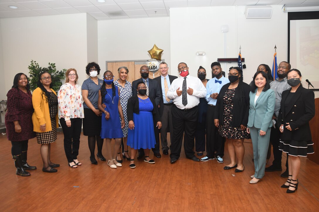 Project SEARCH staff and interns pose for a group photo following the graduation of the Project SEARCH class of 2022 at JBA, Md., May 13, 2022. Joint Base Andrews teamed up with Prince George’s County Public Schools to host the interns for the program throughout the school year. (U.S. Air Force photo by Senior Airman Spencer Slocum)