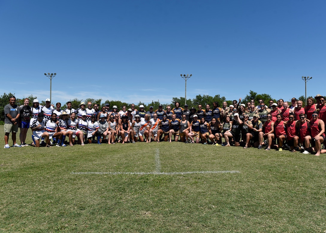 The U.S. military branches of service Women’s 7s Rugby teams pose for a group photo at Cape Fear River Park, N.C., June 25, 2022. The teams competed in the Armed Forces Rugby Tournament, June 24-25th, all going against one another to win first place. (U.S. Air Force photo by Airman 1st Class Austin Pate)