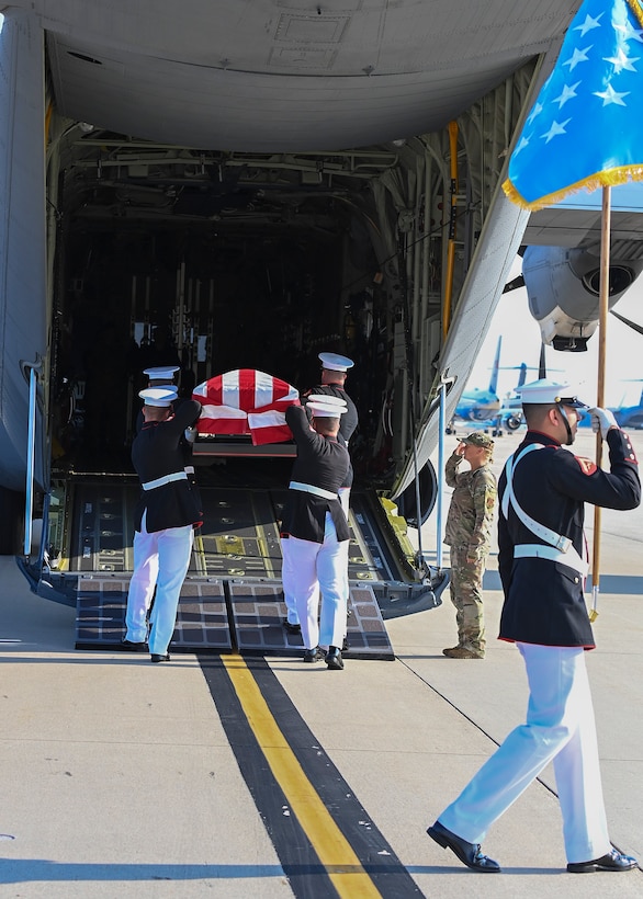 The late Hershel “Woody” Williams, the last surviving Medal of Honor recipient from World War II, departs in a flag-covered casket from Joint Base Andrews, Md., July 15, 2022. He was honored in the Capitol Rotunda on July 14, 2022 and his family held a wreath laying ceremony at the World War II Memorial. (U.S. Air Force photo by Airman 1st Class Matthew-John Braman)