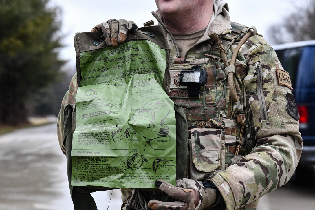 Senior Master Sgt. Jason Knepper, Air Force Reserve Command security forces training manager, demonstrates how to detonate a claymore on March 17, 2023, at Camp James A. Garfield Joint Military Training Center, Ohio. Knepper demonstrated claymore defense tactics to Integrated Defense Leadership Course students to develop combat readiness skills necessary for wartime situations. (U.S. Air Force photo by Staff Sgt. Christina Russo)