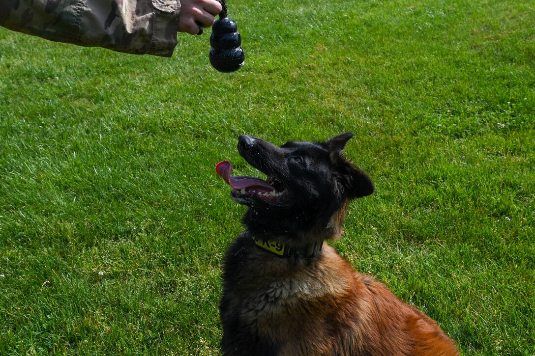 Rreno, one of the 316th Security Support Squadron’s military working dogs, eyeballs a chew toy at Joint Base Andrews, Md., May 3, 2024. Rreno was rewarded with a toy for his performance during training. (U.S. Air Force photo by Airman 1st Class Martha Moore)