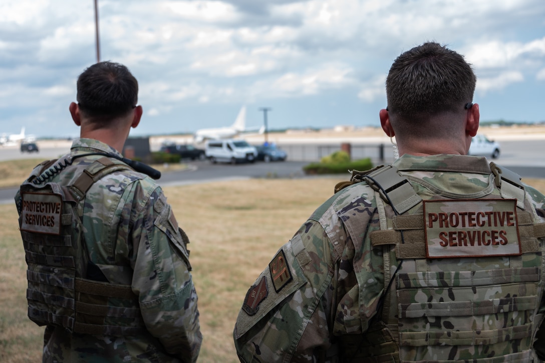 U.S. Air Force Tech. Sgt. Joseph Jahnke, left, and Tech. Sgt. Jacob Tussing, both assigned to the 816th Security Forces Squadron, oversee national delegation arrivals at Joint Base Andrews, Md., July 10, 2024. The 2024 NATO Summit in Washington, D.C. brought together NATO allies and partners for the alliance’s 75th anniversary. (U.S. Air Force photo by Staff Sgt. Alex Broome)
