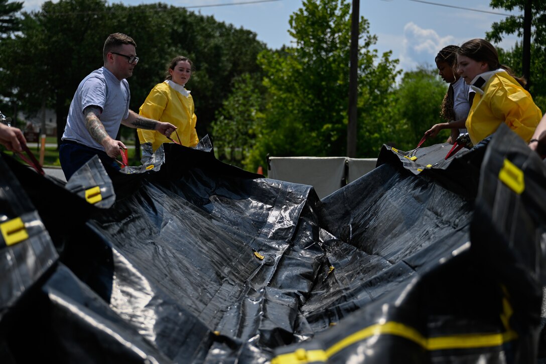 U.S. Airmen assigned to the 316th Medical Group unfold a decontamination tent during a decontamination exercise at Joint Base Andrews, Md., July 31, 2024. The exercise was designed to enhance their ability to quickly set up decontamination stations during incidents involving hazardous materials. (U.S. Air Force photo by Staff Sgt. Isaac March
