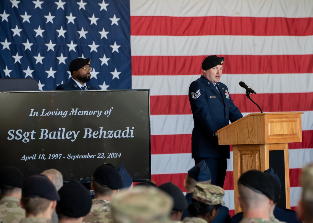 U.S. Air Force Tech. Sgt. Justin Butler, 316th Security Forces Squadron flight sergeant, addresses the audience during the memorial service for Staff Sgt. Bailey Behzadi at Joint Base Andrews, Oct. 21, 2024. As Behzadi’s supervisor, Butler shared personal memories and paid tribute to Behzadi’s dedication and impact on those around him. (U.S. Air Force photo by Staff Sgt. Aubree Owens)