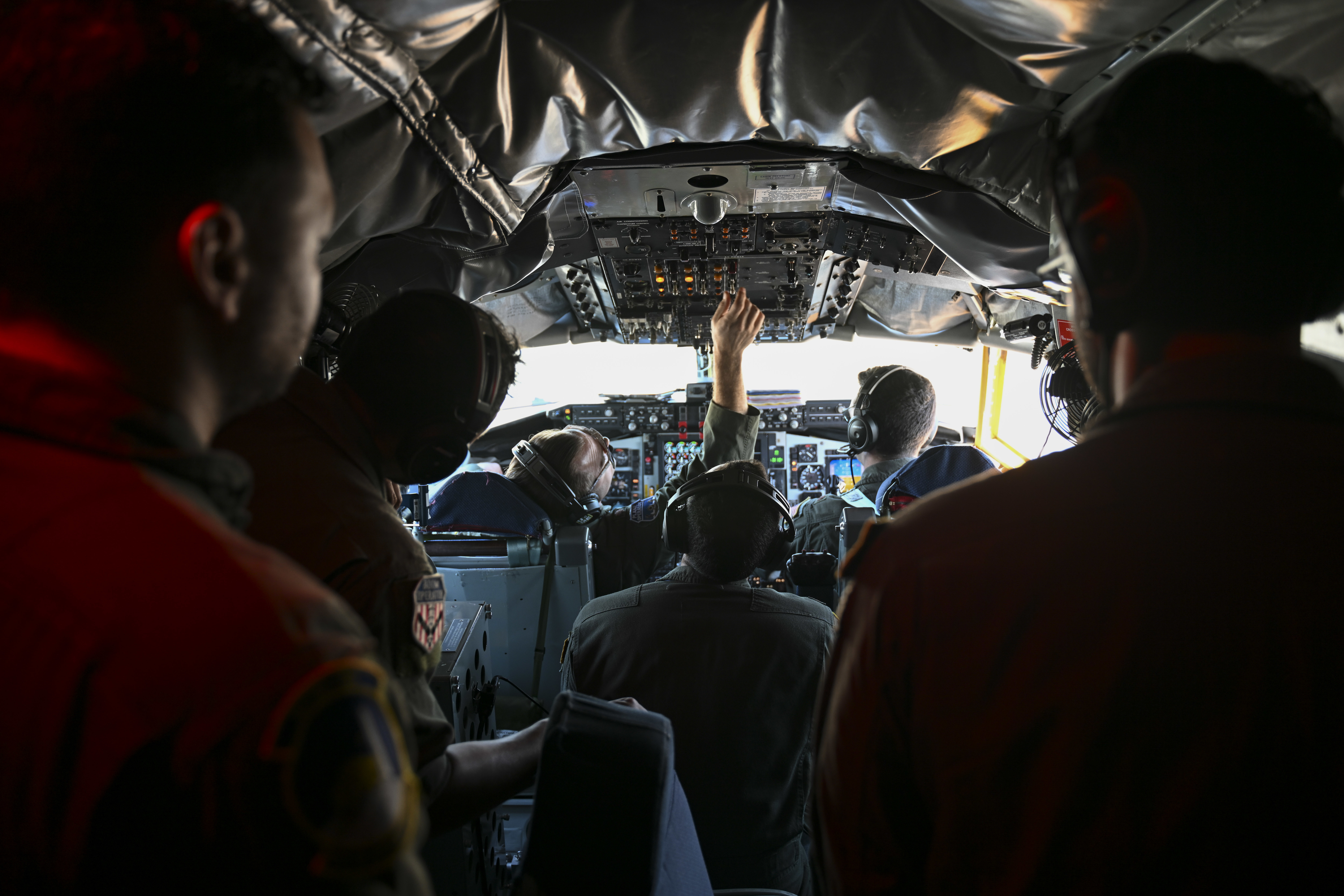 U.S. Air Force aircrew members assigned to the 459th Air Refueling Wing prepare for a refueling mission aboard a KC-135 Stratotanker at Joint Base Andrews, Md., April 22, 2025. The 459th ARW operates the KC-135 to extend the global reach of U.S. and allied forces. (U.S. Air Force photo by Senior Airman Gianluca Ciccopiedi)